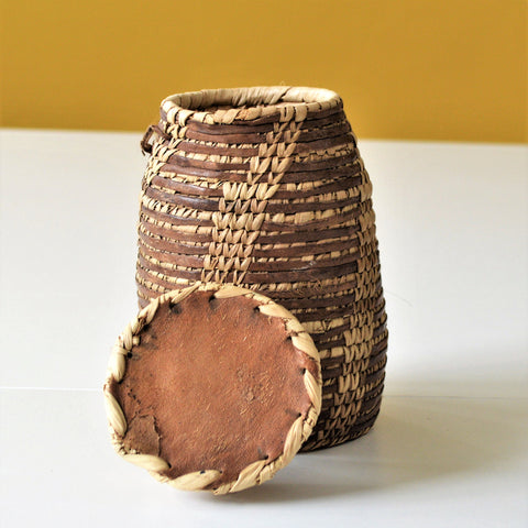 Moroccan rustic basket, Leather & palm leaf jewelry pot